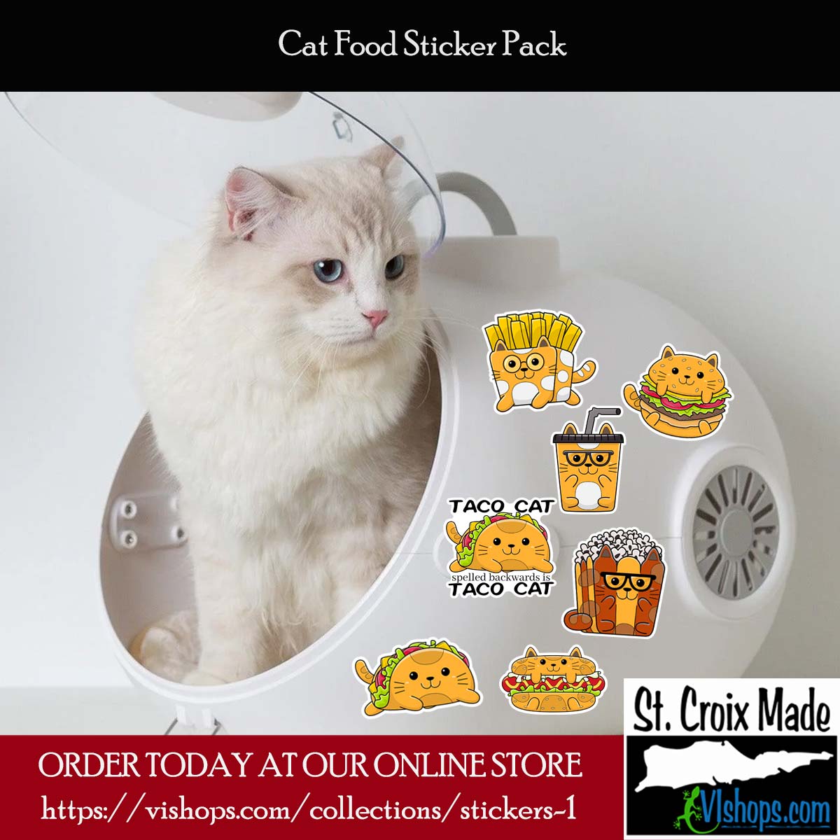 Get the whole Cat Food sticker collection and show your love of Cats and Tacos, Soda, Popcorn, Hotdogs, Burgers, and Fries.
